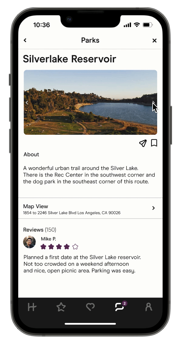 Sabrina finds the Silverlake Reservoir and reads the visitor reviews. She decides to suggest this place and clicks the share icon to message.