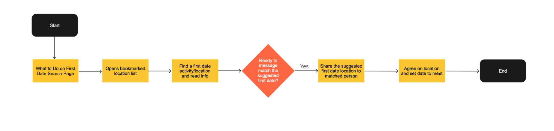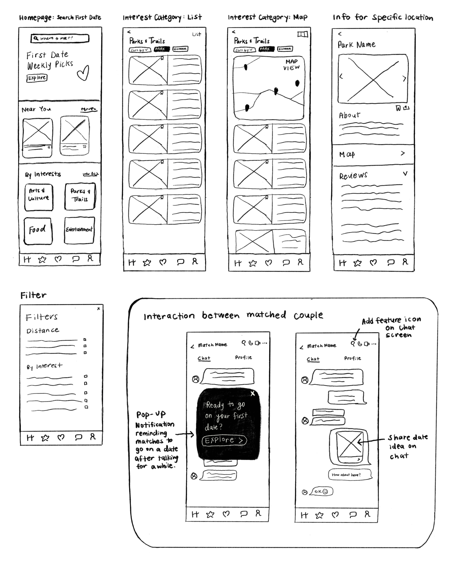 Based on the site map and reviewing the current interface, I created wireframe sketches for the "Search for a First Date" feature, focusing on the homepage and destination informations.