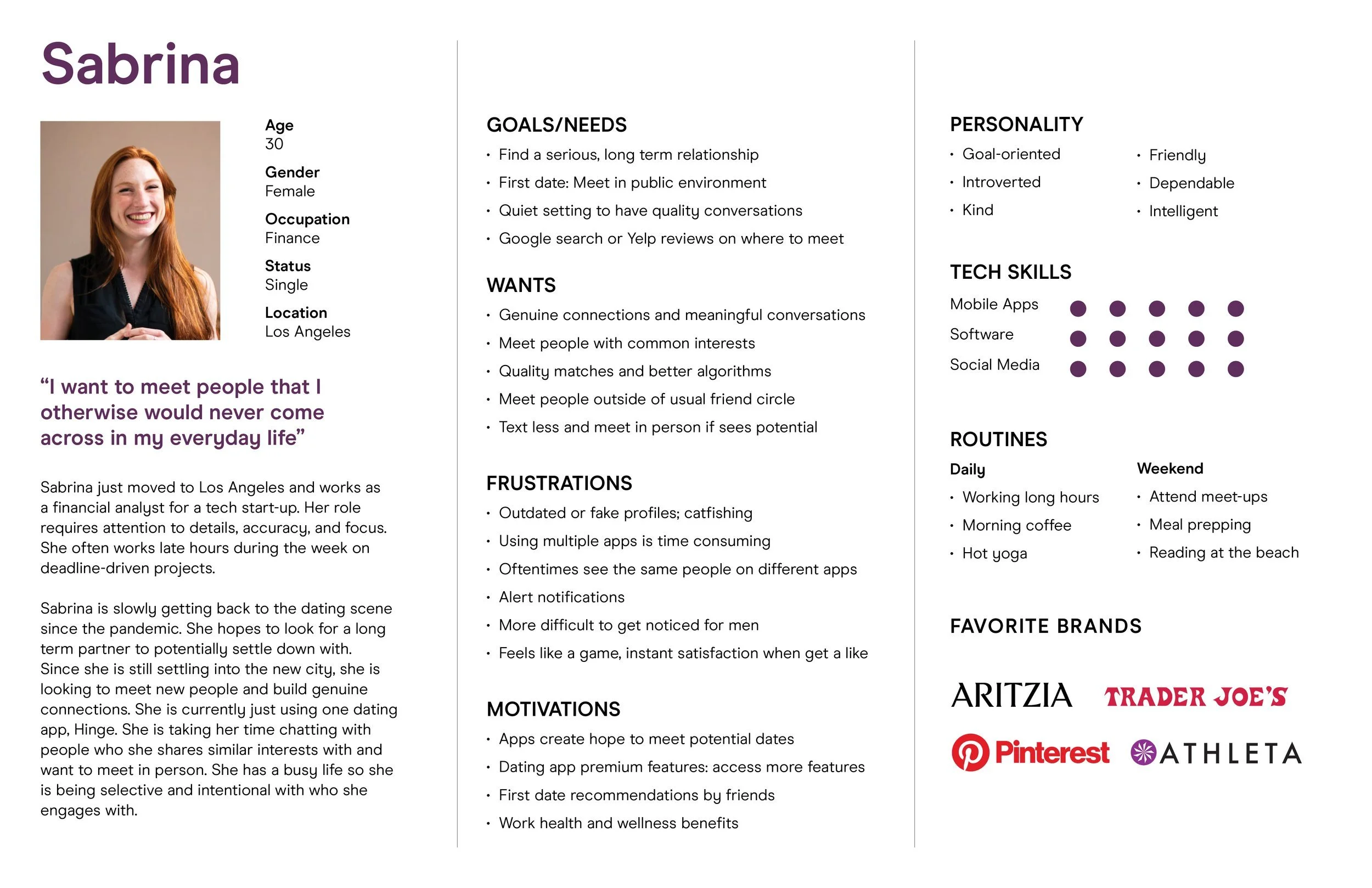 Based on the user interviews and market research, I created a persona, Sabrina, who represented an ideal user for using online dating apps.