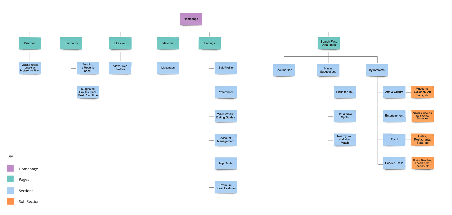 The architecture of Hinge includes features that are currently on the app and shows where the new added feature will incorporate into the interface. The "Search for First Date" feature is visible through the message screen as an icon or notification alert and includes a curation of categories by interests such as Outdoors, Arts and Culture, Entertainment, and Food.